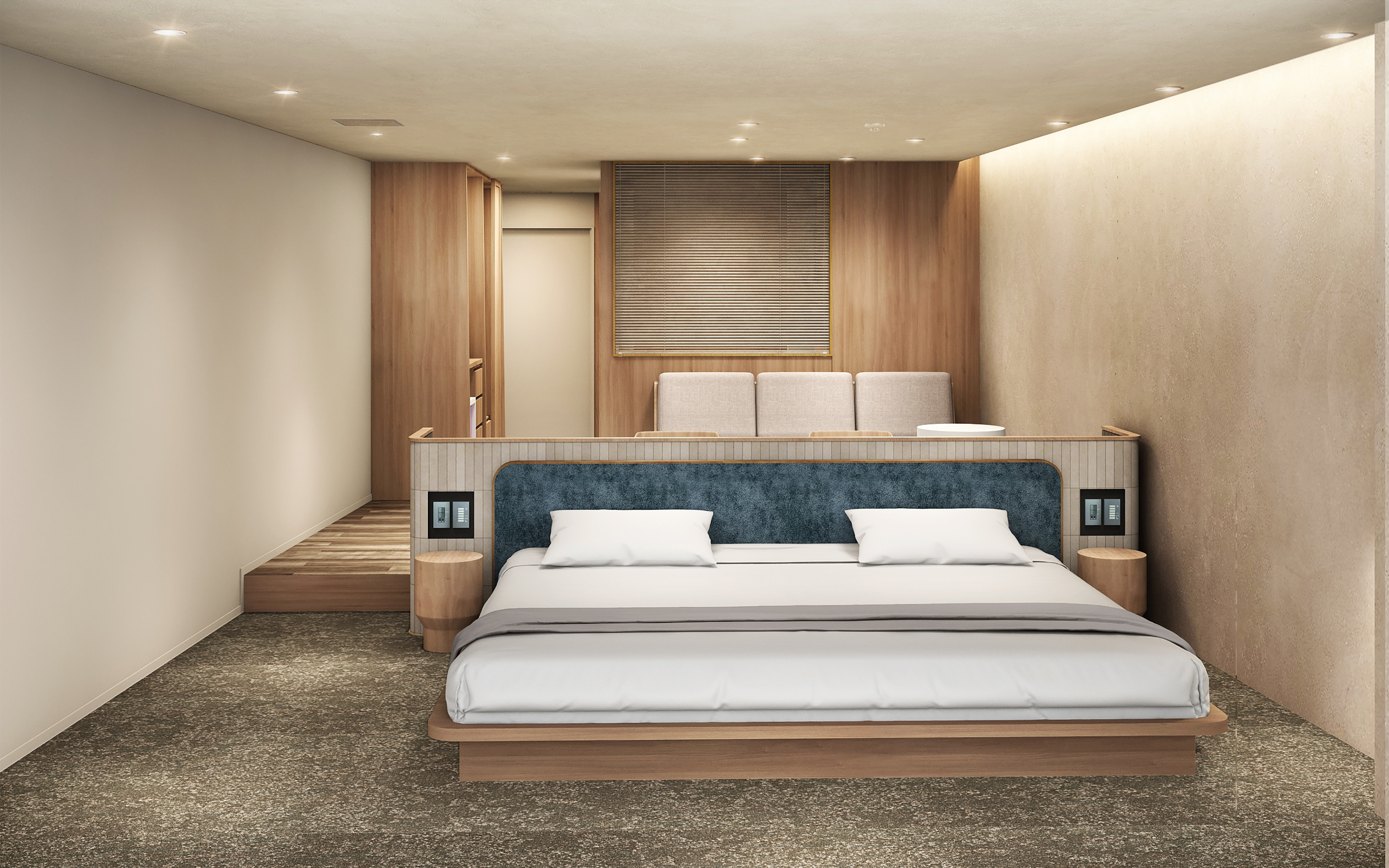 窓側にベッドを配置し、目覚めの瞬間から景色とともに一日が始まる設え。素材感とぬくもりを大切にした内装が、心地よい滞在時間を叶えます。