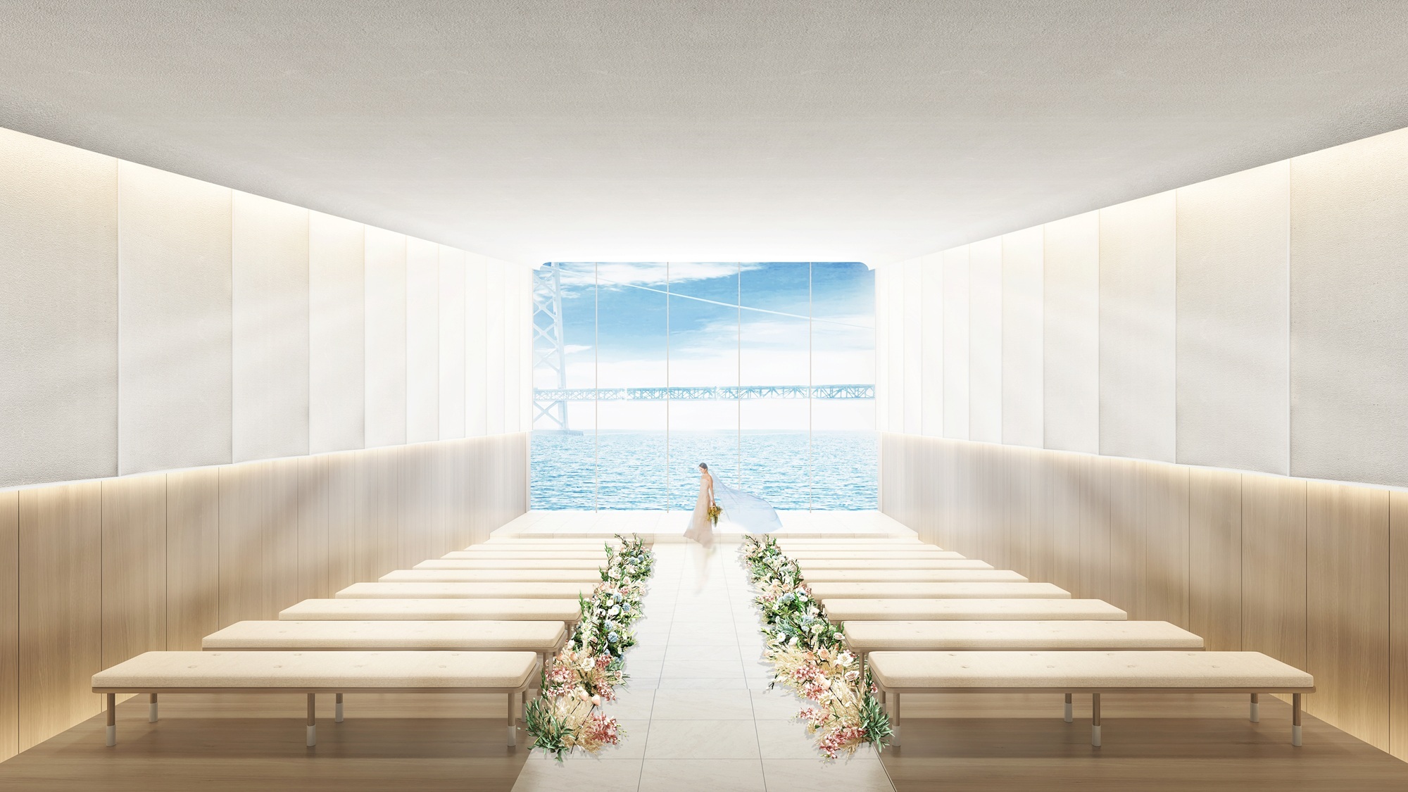 光を柔らかく反射する壁と天井。正面に広がる景色を最大限に生かし、景色と想いが重なり合う、神秘的で心に深く残る誓いの空間へと生まれ変わります。