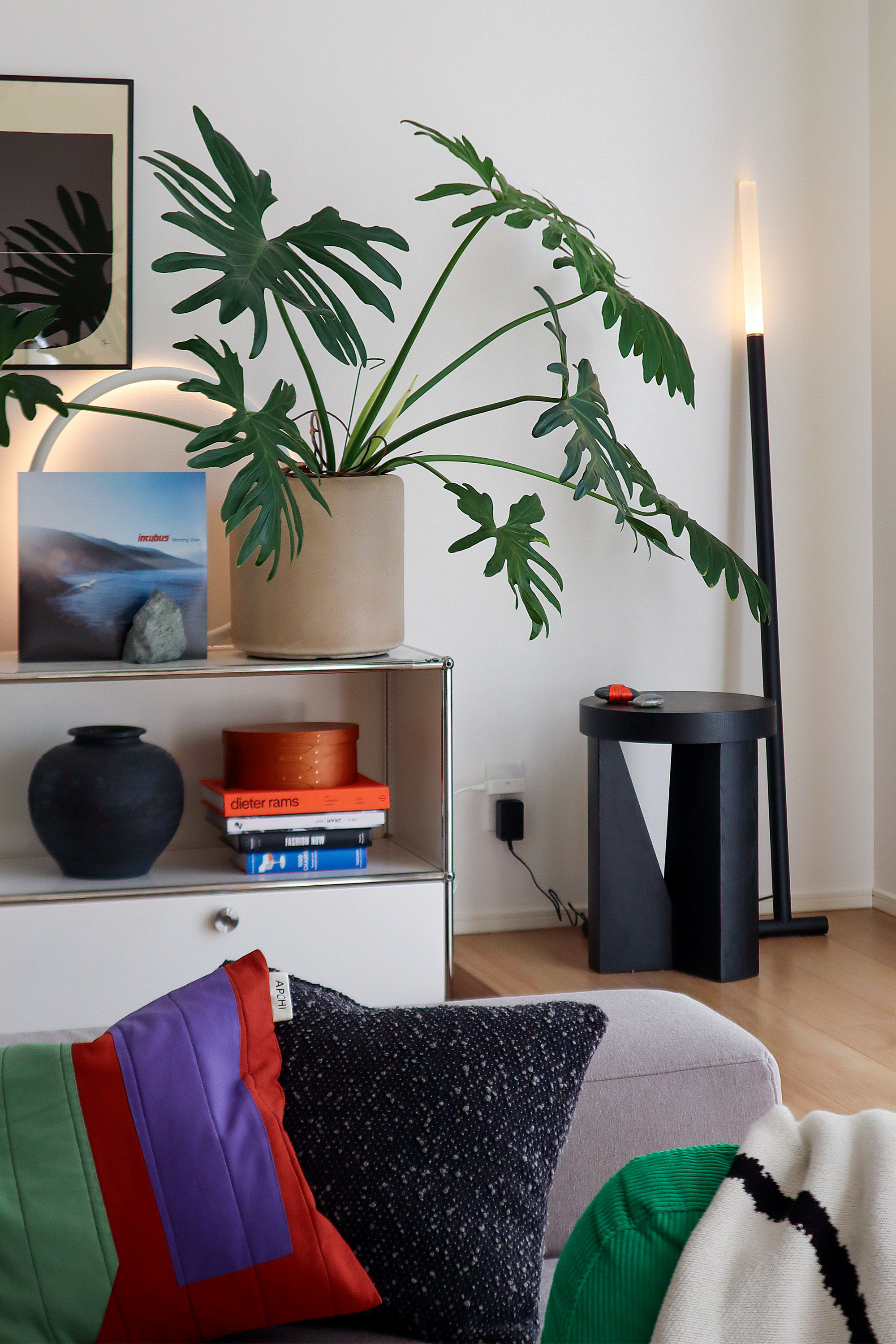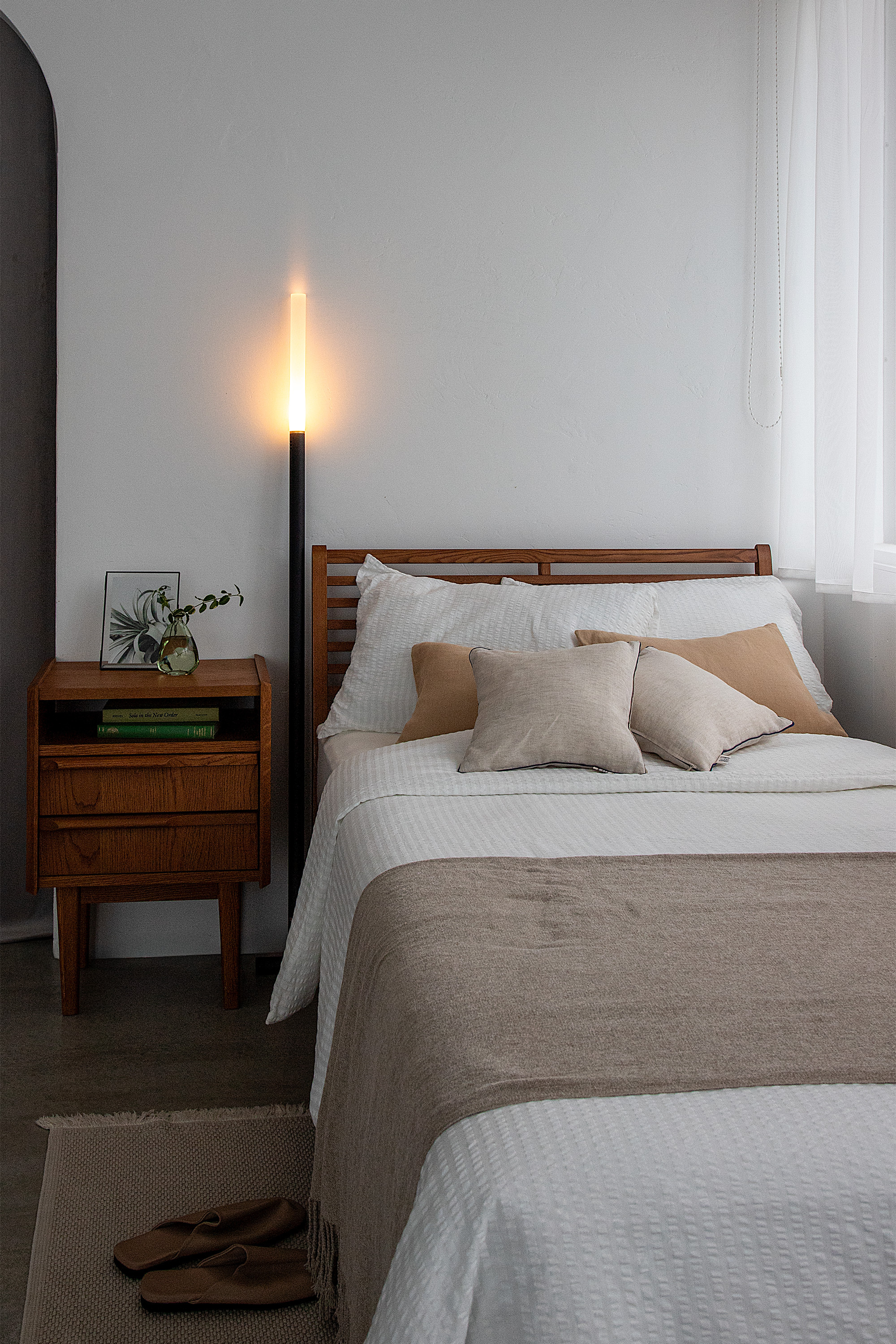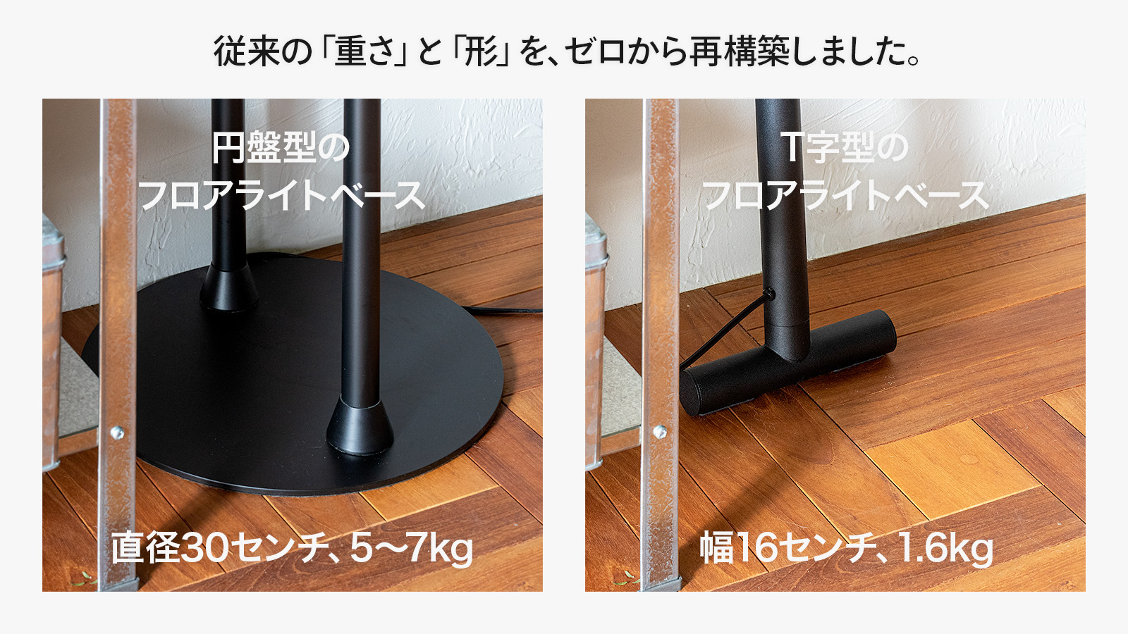 従来のフロアライトは、5~7kgにもなる円盤型のベースによって壁際にぴったりと配置できず、無駄な隙間を生みがちです。