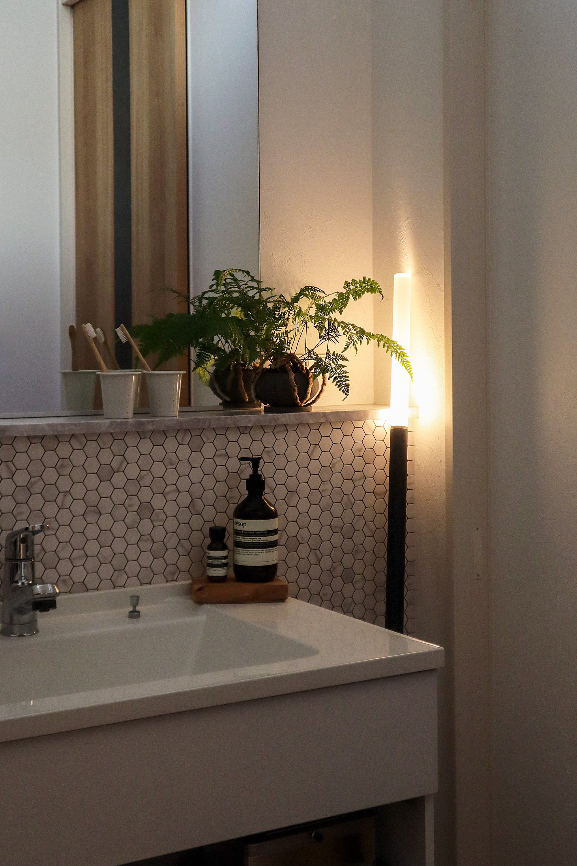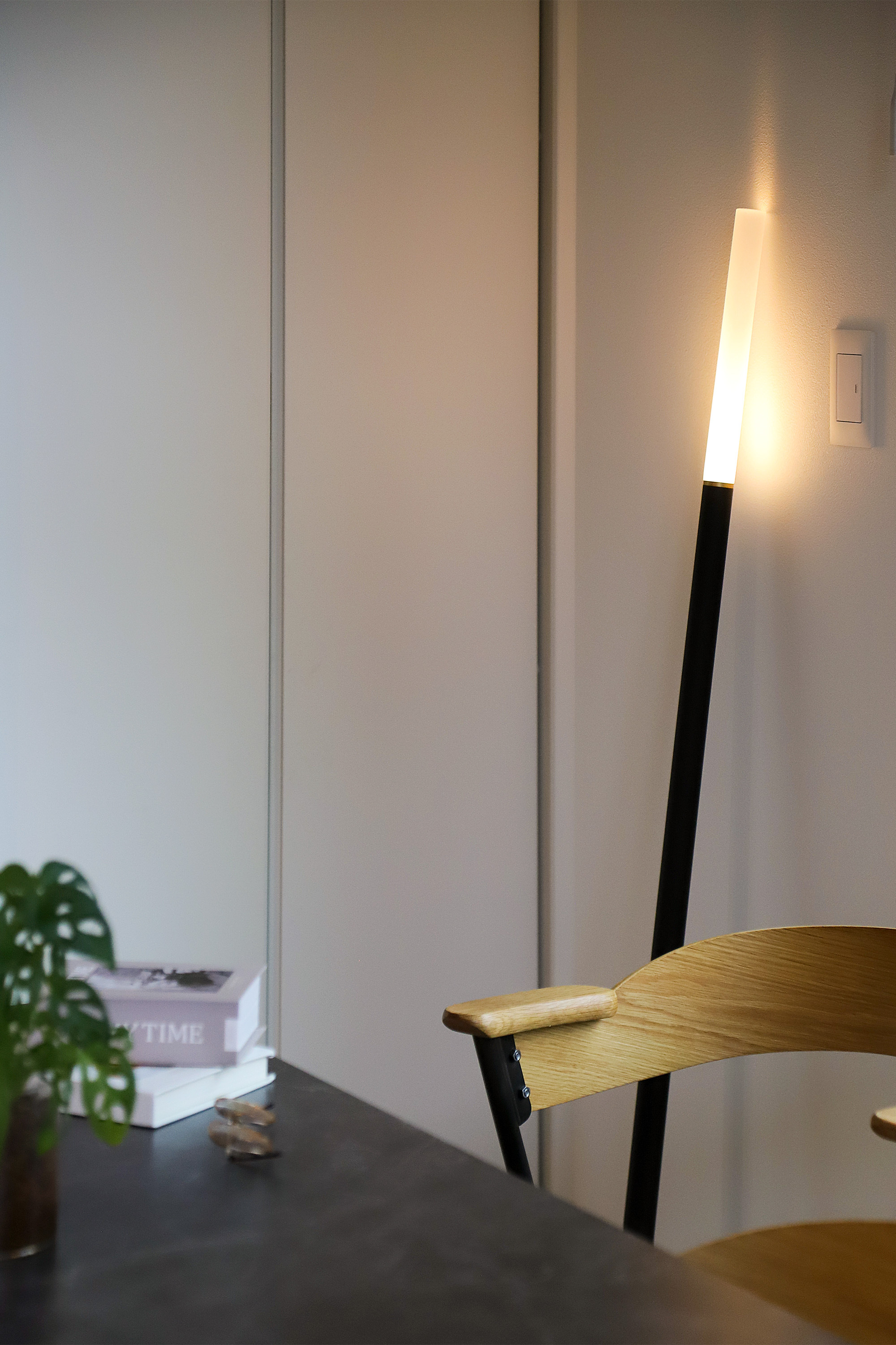 空間を圧迫するランプシェードと重たいベースを思い切って取り払い、壁を新たなシェードとして光をデザイン。