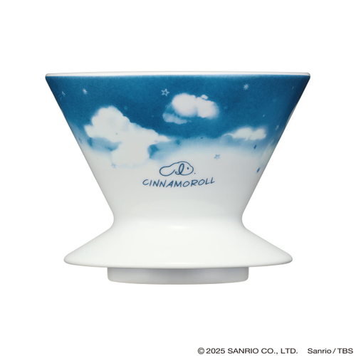 白磁の美しい白に藍色で空と雲が描かれた、円錐型のドリッパー。I.CINNAMOROLLのロゴマーク、ゴロゴロするシナモンとお友だちのミルク、ふたりのキュートなうしろ姿が、三面にデザインされています。