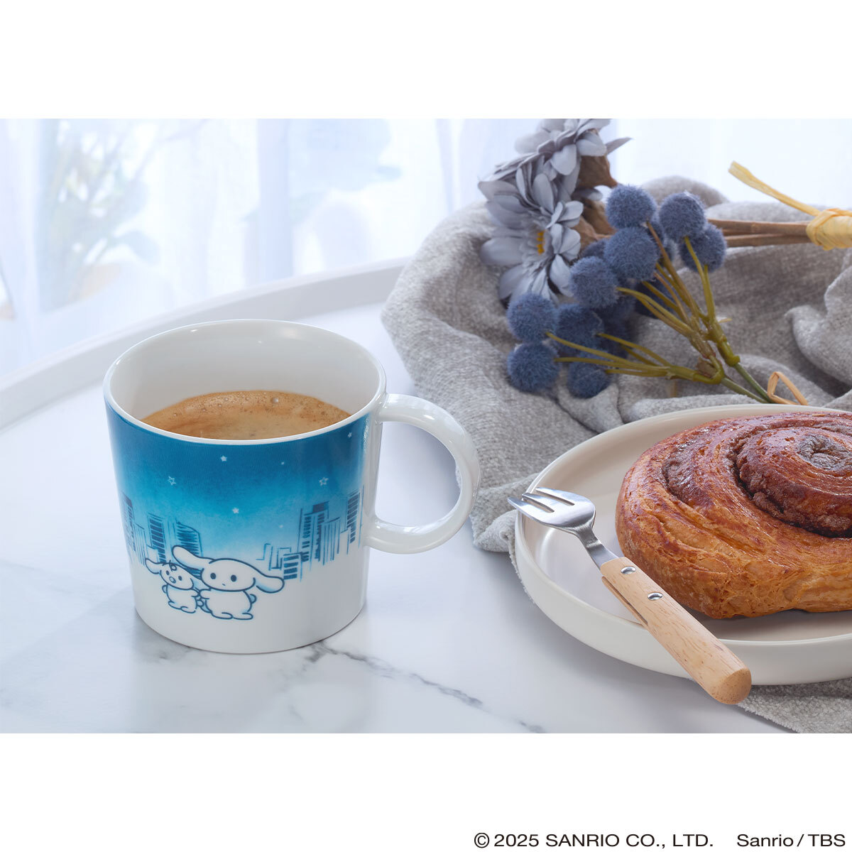 シンプルなスタイルで、使い勝手のよいサイズのマグカップ。持ち手は大きめでしっかりと指がかかり、安定感があります。持ち手が右側になる面には、都会の空のもと、なかよく手をつなぐシナモンとミルク。反対面には、空を見上げるシナモンとミルクが描かれています。