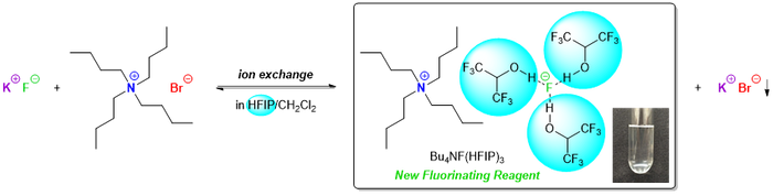 KFは最も安全かつ安価なフッ素化剤の一つとして知られていますが、ほとんどの有機溶媒に難溶であることから、フッ素化反応への利用は限られていました。これに対し、本研究ではKFがフッ素化アルコールに特異的に溶解する特徴を利用して、KFからBu4NF(HFIP)3錯体を簡便かつ高効率で合成する手法を開発しました。