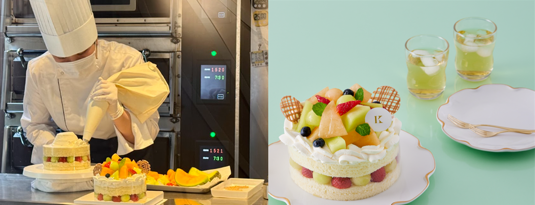 旬の芳醇なメロンをたっぷり飾った「メロンデコレーション」を目の前で仕上げ きのとや白石本店「季節のケーキ工房」「焼きたて工房」2つの工房が新登場