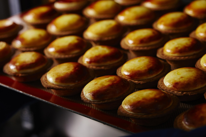 店舗のそばまで近づくと、外からでもチーズの香ばしさや、バターの芳醇な香りが感じられ、定番人気の「焼きたてチーズタルト」や、こだわりのカスタードを詰めた「焼きたてカスタードアップルパイ」を焼く様子が、中庭に面した、ガラス張りの焼きたて工房でご覧いただけます。