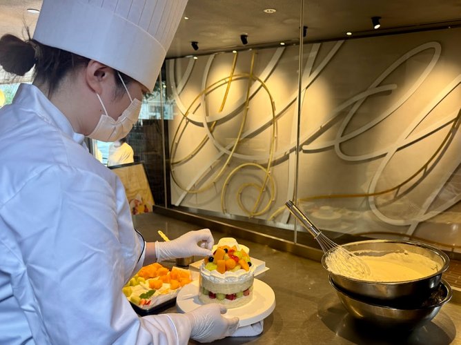 7月限定は「メロンデコレーション」。旬の青肉メロンと赤肉メロンをたっぷりとケーキの上にのせたり、ふわふわのスポンジでクリームや果物をサンドする様子、新鮮な生クリームを泡立てたり絞ったりするのは見応えがあります。