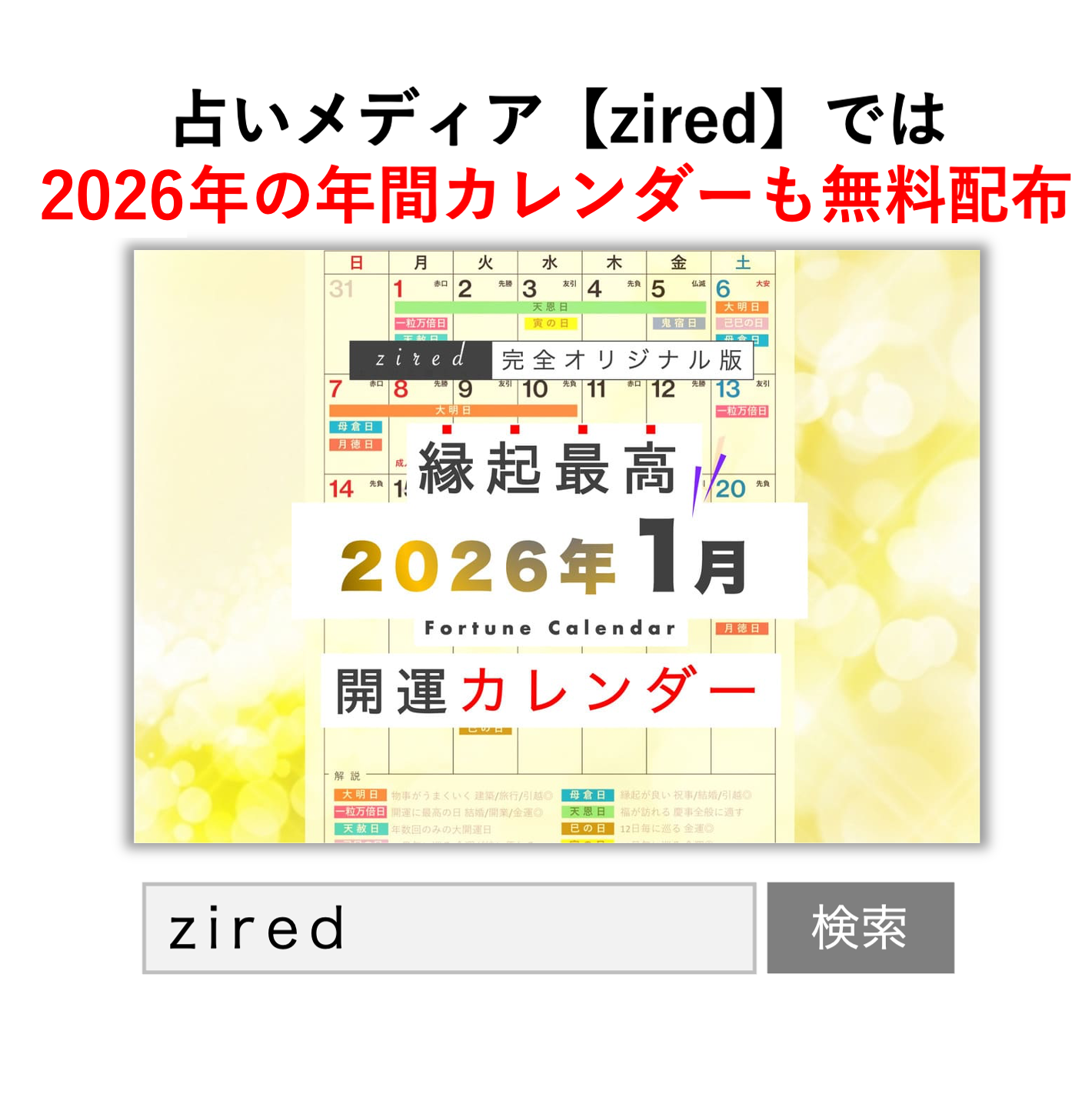 2025年12月21日、占い専門メディアのzired(URL:https://zired.net 運営会社:株式会社リーチゼム)は、『吉日カレンダー2026年1月版』をリリースしました。