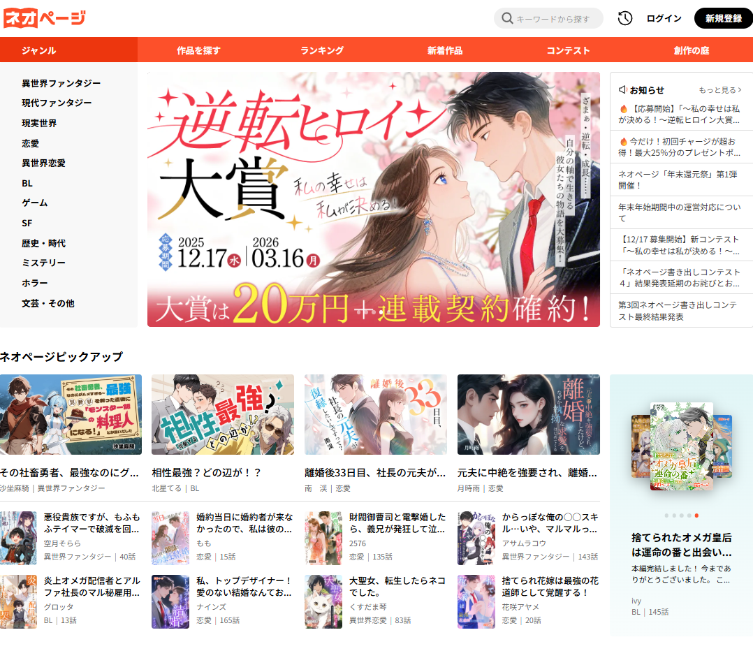 株式会社ネオページ(本社:東京都千代田区、代表取締役:小川傑子)が運営するWEB小説投稿サイト「ネオページ」は、