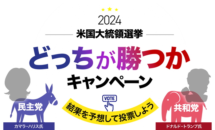 「毎日が財産になる」をコーポレートスローガンに、中長期的な資産形成環境をご提供する株式会社マネースクエア(本社:東京都港区、代表取締役会長兼社長:相葉 斉、以下「当社」)は、この度、米国大統領選挙「どっちが勝つかキャンペーン」を開催することに併せ、当社エコノミストによる解説が読める特設ページを公開いたしましたのでお知らせいたします。(※投票いただくにはログインが必要です。)