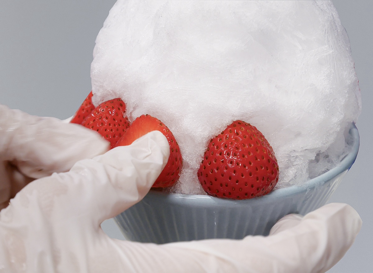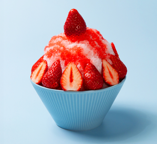 器の底にはバニラソフトクリームを絞り、その上にいちごのシロップをかけて氷を削り、再度シロップを挟んで氷で覆い、上にいちごをデコレーションしています。シロップは純氷を製造している宮下製氷冷蔵株式会社のものを使用し、低温殺菌でいちごの種まで残した鮮度感のある、着色料・人工甘味料不使用の生シロップです。別添えにして、食べる直前にお客さまご自身にかけていただきます。そのため、商品提供時には、真っ白な氷にフレッシュいちごがよく映えた状態となり、可愛いとご好評をいただいています。練乳は使わず、フレッシュいちごとバニラソフトクリームで織りなす、いちごミルクです。