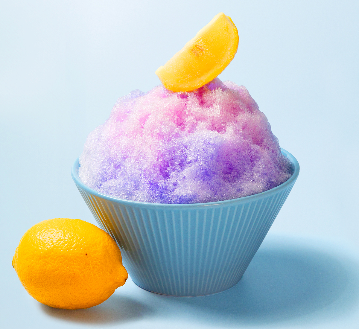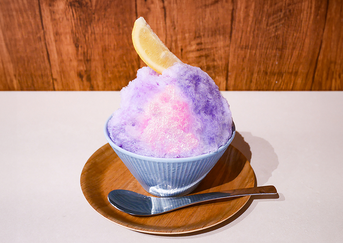 紫とピンクの涼やかな色合いの「マンゴーとレモンのあじさいかき氷」は、サプライズ満載の遊び心のある一品。氷の上には、アンチエイジング効果が高いとされるバタフライピーのシロップを掛け、レモンを乗せて提供します。そこに、お客さまご自身でレモンシロップを吹きかけていただくと、見る間に氷が紫からピンクへと変化します。これはバタフライピーに含まれるアントシアニンという天然の青色色素が、レモンシロップの酸と化学反応を起こしたことによるものです。