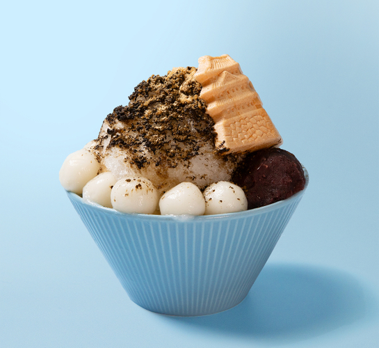 さらにきな粉をふりかけ、白玉は8個トッピング。あんことお城の形のもなかを添えた、「和」がいっぱいのビジュアルです。あんこは北海道産エリモ小豆と鬼ザラ糖を、職人が直火銅釜で丹精込めて煉り上げたもの。まろやかで満足感のある味わいで、ほうじ茶の香りと共に、贅沢な涼をお楽しみいただけます。