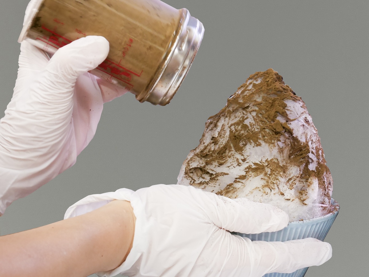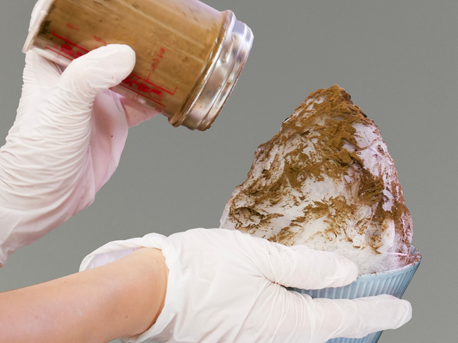 氷の中央にはほうじ茶のシロップを閉じ込め、ふわふわに盛った氷には粉末状にした天空のほうじ茶®︎をたっぷりと振りかけます。香ばしくもふくよかなほうじ茶の香りがより強く感じられるように、上に掛けるほうじ茶はシロップではなく粉末を採用しました。