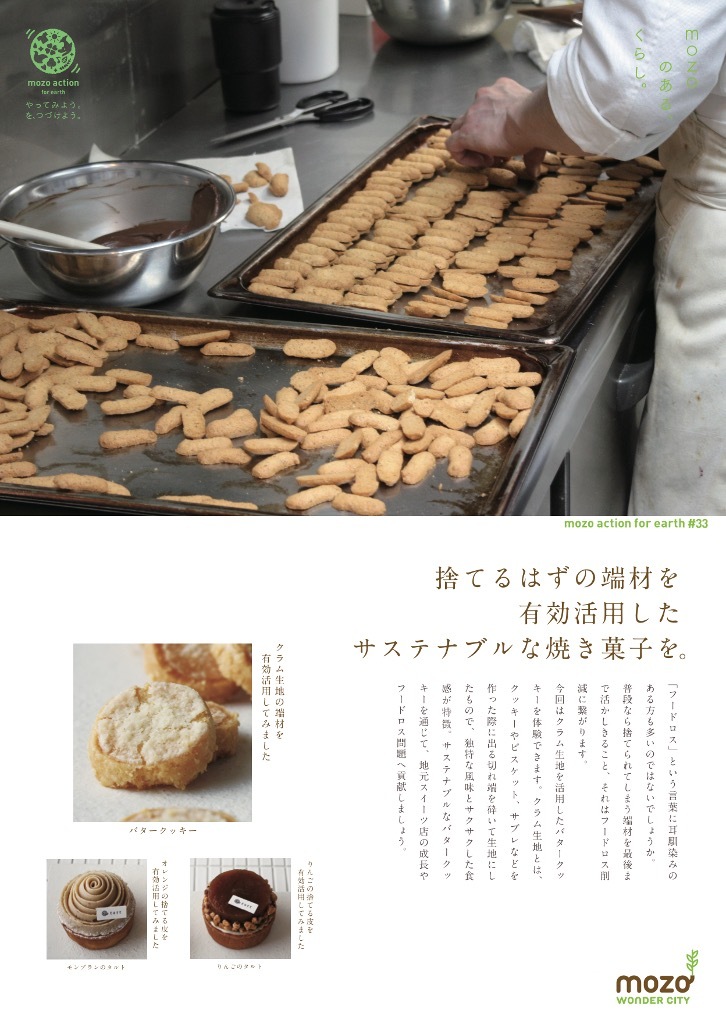 環境課題として昨今取り沙汰されるフードロスの問題。この問題は未利用の資源であるプレコンシューマーと食べ残しのようなポストコンシューマー、2つの問題が存在します。今回のmozo actionでは本来製造過程の中で焦点が当たり辛いプレコンシューマーを有効活用しながら、焦点を当てたからこそ生まれる「新味」をキュームタルトさまと共同で開発をしました。結果、タルトには従来の発想では生まれなかった新しい味のコントラストが生まれ、クッキーにおいても普段廃棄処理を行う端材から新たな製品が生まれるに至り、これらをmozoご来館者さまへ先行的に体験いただくイベントを実施致します。