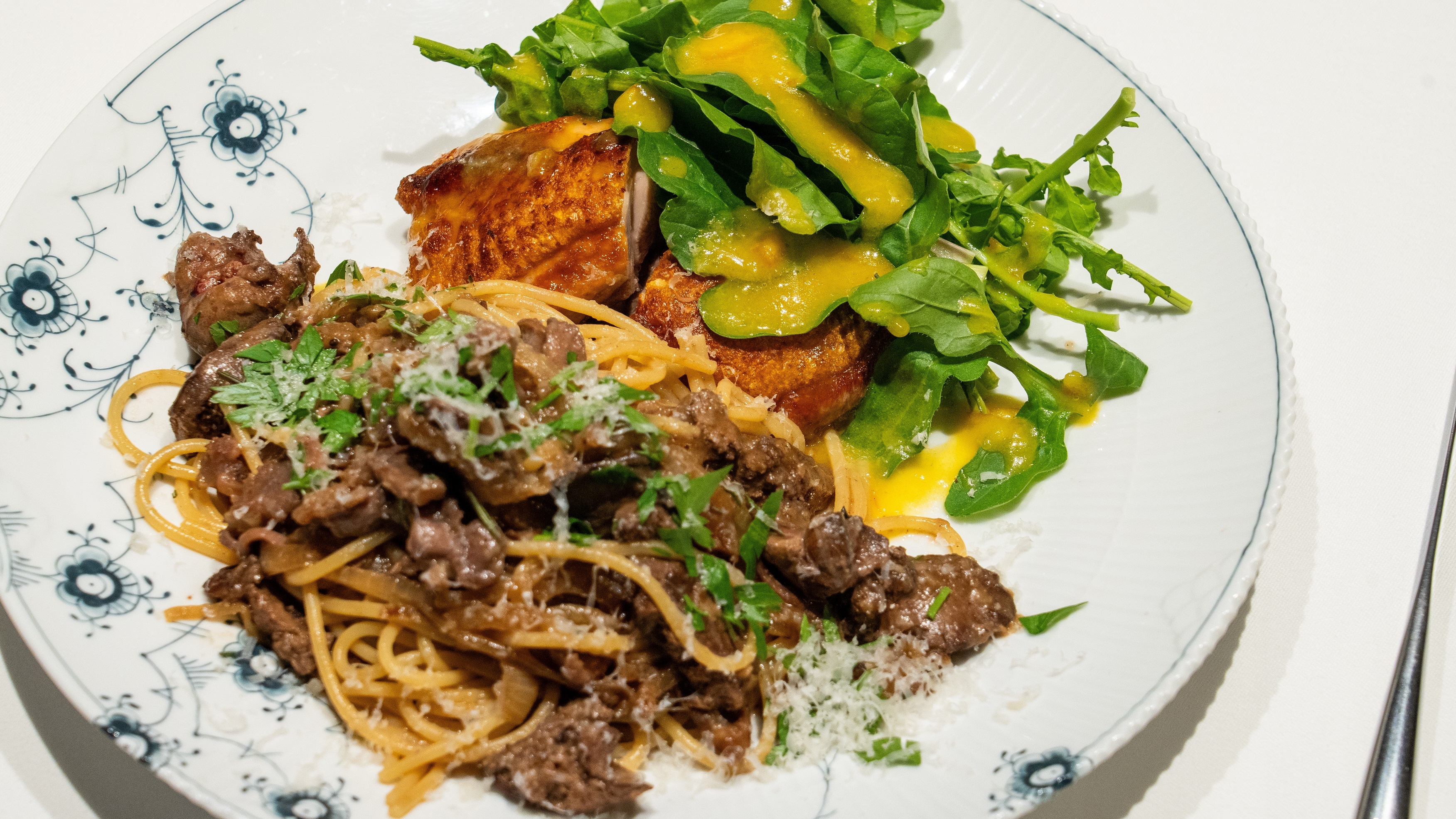 また、明治屋恵比寿ストアーで購入した食材を使用してイタリアンのワンプレート料理に仕上げていただきました。内容はルッコラのサラダ、地鶏のソテー、砂肝とレバーのパスタがひと皿に載った「鶏のピアットウニコ」。見た目も豪華なワンプレートで、クリスマスや年末などにピッタリのごちそうレシピです。