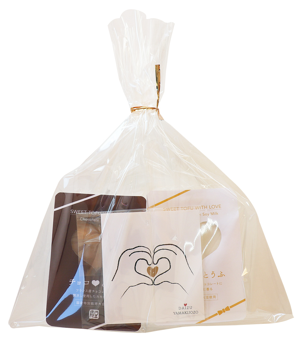 2種類のチョコ豆腐に、開くと思わずにっこり微笑んでしまうオリジナルのDAIZUカードを入れてプレゼント用にラッピングしました。ユーモアあふれるギフトです。