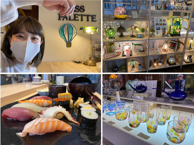 「鮨さもん」で美味しいランチをいただいた後は、佐賀市の重要無形文化財に指定されている「肥前びーどろ」の製造・販売をされている「副島硝子工業」を訪問。とても美しい伝統の技に見とれてしまいます。最後は佐賀市歴史民俗館旧久富家にあるステンドグラス工房ではステンドグラス制作体験を行ないました。ぜひ皆さんも行かれてみてください。