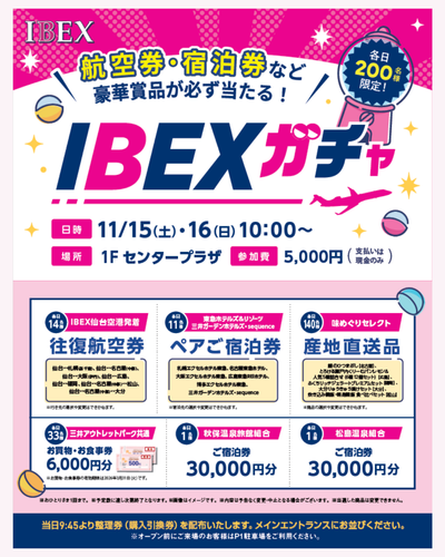【航空券・ホテル宿泊券など当たる!】IBEXガチャ in 三井アウトレットパーク仙台港 開催のお知らせ