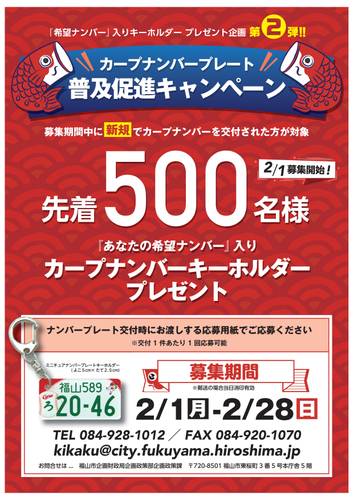 広島県福山市では、今回,更なる普及促進に向け、第2弾となるカープナンバーキーホルダープレゼントキャンペーンを実施します。