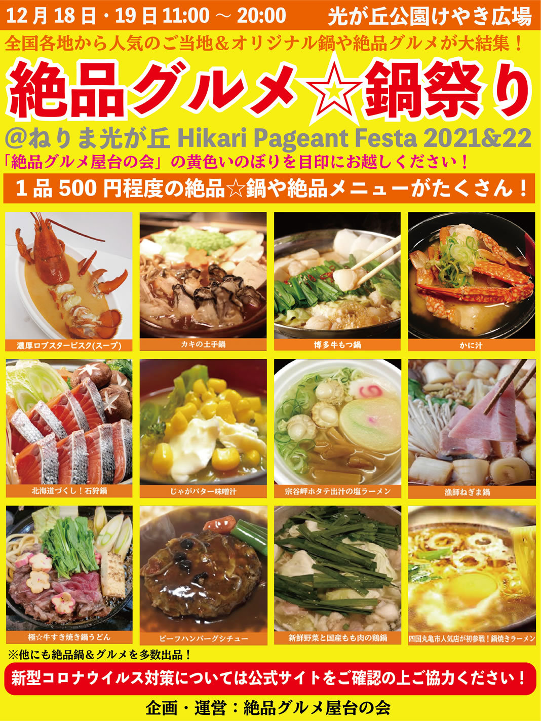 全国各地の食フェスやグルメイベントで活躍する有力店が結集し人気を博す絶品グルメ屋台の会(所在地:埼玉県さいたま市南区)では、ねりま光が丘地域力活性化プロジェクト実行委員会(東京都練馬区光が丘)主催の「ねりま光が丘Hikari Pageant Festa」と共同で、2021年12月18日・19日に都立光が丘公園けやき広場(練馬区光が丘4-1-1)にて、ワンコイン:500円以下から楽しめる“庶民派鍋フェス”「絶品グルメ☆鍋祭り2021@光が丘公園」を開催します。
