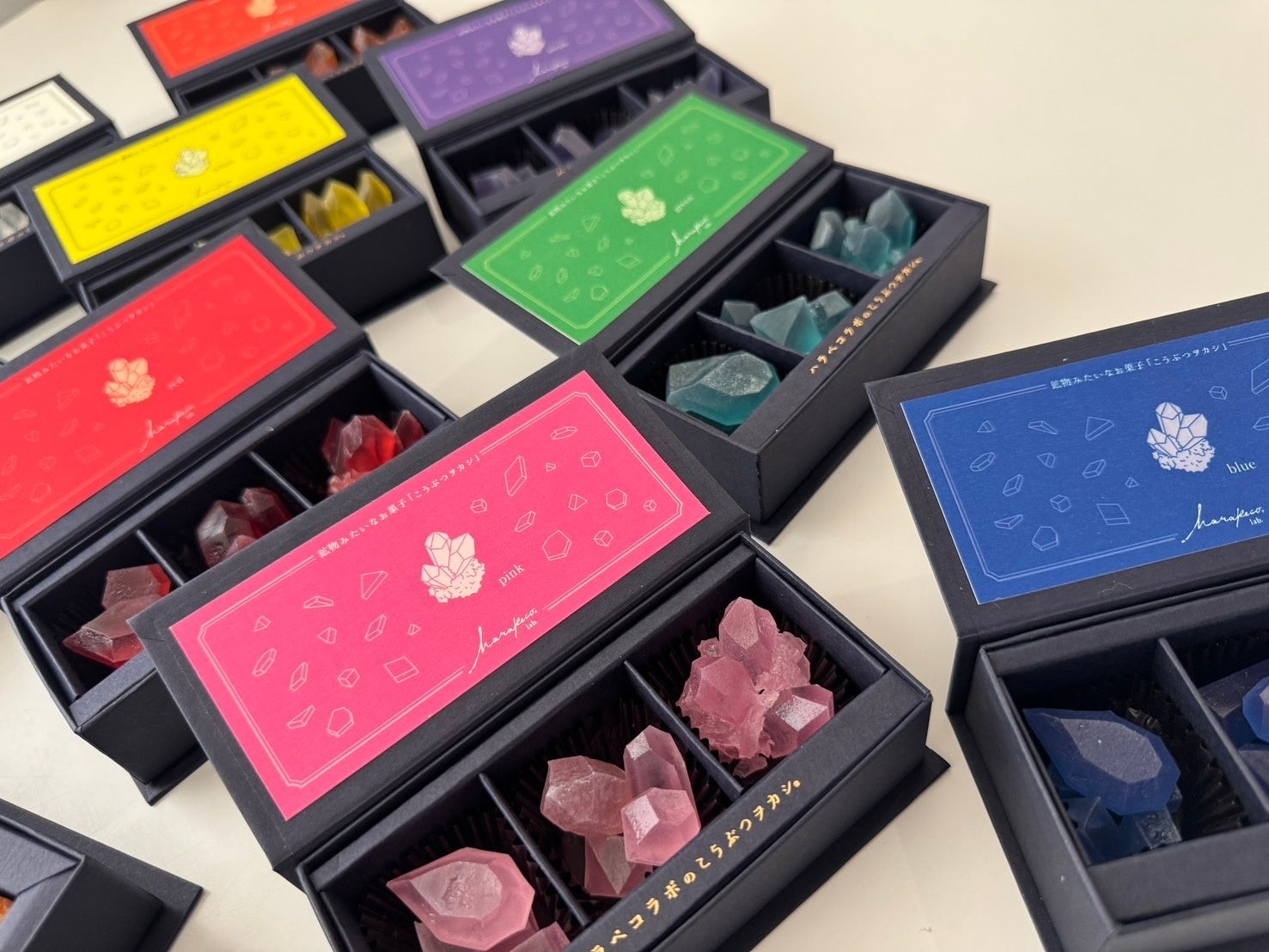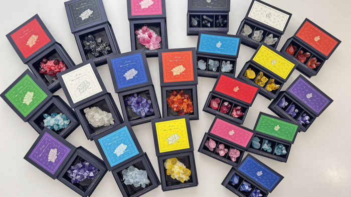 「推し色のこうぶつヲカシ」は、“自分の推し” や “大切な人の好きな色”を選んで楽しめる全10色展開のこうぶつヲカシ。宝石や鉱物をモチーフにした琥珀糖は、職人がひとつひとつ小刀で切り出して丁寧に仕上げ、まるで本物の鉱石のような透明感と輝きを放ちます。
