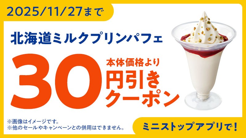 ミニストップは、北海道産生クリームと練乳の濃厚なミルク感のミルクプリンを使用した「北海道ミルクプリンパフェ」を、2025年11月21日(金)より、国内のミニストップ店舗にて発売します。真っ白なミルクプリンと「北海道ミルクソフト」を合わせ、真っ赤なフランボワーズソースと、鮮やかな緑色のピスタチオをトッピング。クリスマスが近づく季節にぴったりの、ワクワク感のあるパフェをお楽しみください。