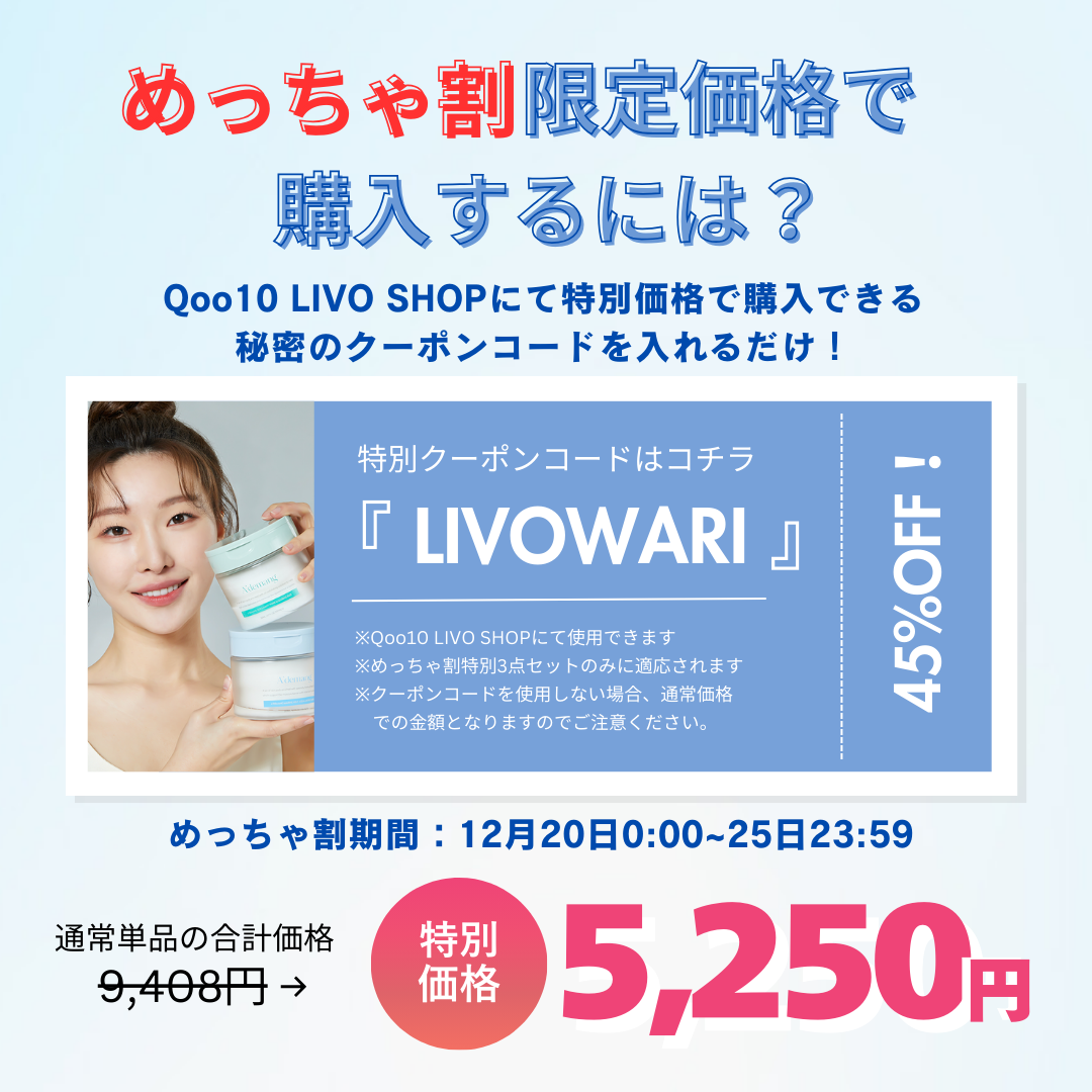 メガ割を待たずに!めっちゃお得に韓国スキンケア・コスメを購入できるサービス!めっちゃ割期間中、Qoo10 LIVO SHOPにて指定の商品がお得に購入できる秘密のクーポンコードを発表!
