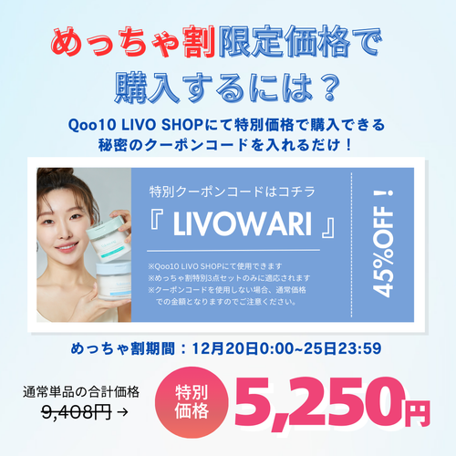 めっちゃ割クリスマス3点セットを特別価格で購入するにはQoo10 LIVO SHOPにて下記の秘密クーポンコードを入れるだけ!3点単品で購入すると合計9,408円のところからなんと45%OFF!特別価格、5,250円で購入できちゃいます!