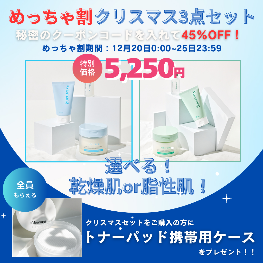 今回『めっちゃ割』第一弾はA'demangから、乾燥肌or脂性肌が選べる!クリスマス3点セットを発売!さらに購入した方、全員にトナーパッド携帯用ケースをプレゼント♡