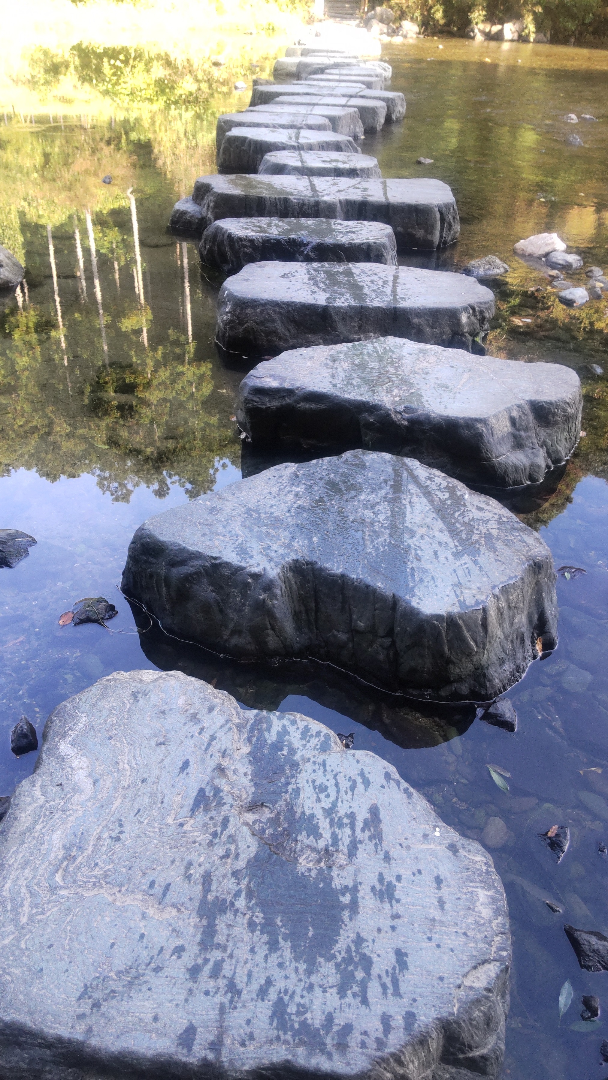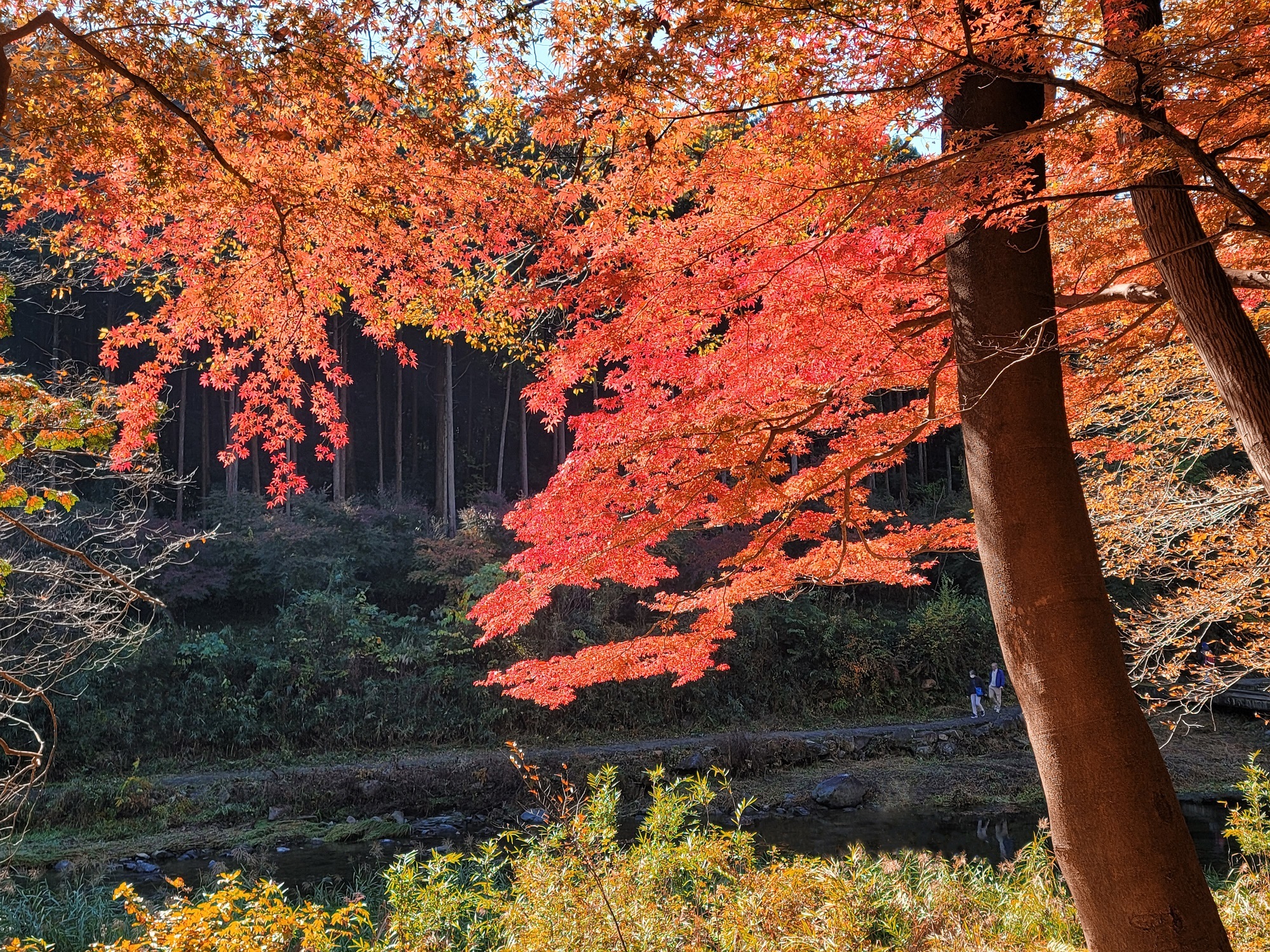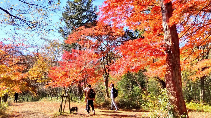 見どころは、槻川を大きな石で渡る「飛び石」周辺と、展望台から与謝野 晶子歌碑へ向かう遊歩道。新緑はもちろん、秋にはイロハモミジ、ハウチワカエデ、コナラ、クヌギなど赤や黄色に色づき、華やかな木々が水面に映る彩りを楽しめます。遊歩道も整備されており、都心から1時間とは思えない景色や鳥のさえずりに癒されます。
