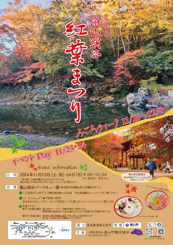 一般社団法人嵐山町観光協会(所在地:埼玉県比企郡嵐山町、理事長:高橋 兼次)は、2024年11月23日(土・祝)、24日(日)嵐山渓谷バーベキュー場において、「嵐山渓谷紅葉まつり」イベントDayを開催します。