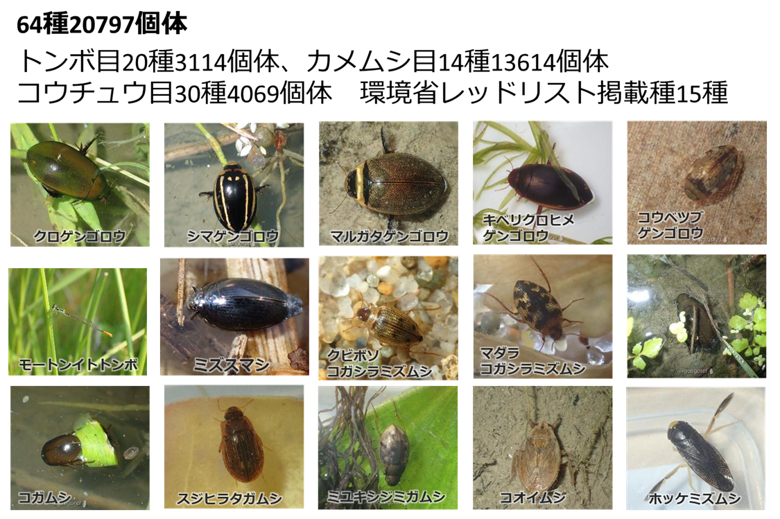さらに、ゲンゴロウ類やトンボ類などの一部の水生昆虫類は森林で越冬・採餌し、繁殖期には水域へ移動することが知られています。このような生態から、水田だけでなく森林を含めた景観構造が、水生昆虫類の多様性に影響を及ぼす可能性があります。