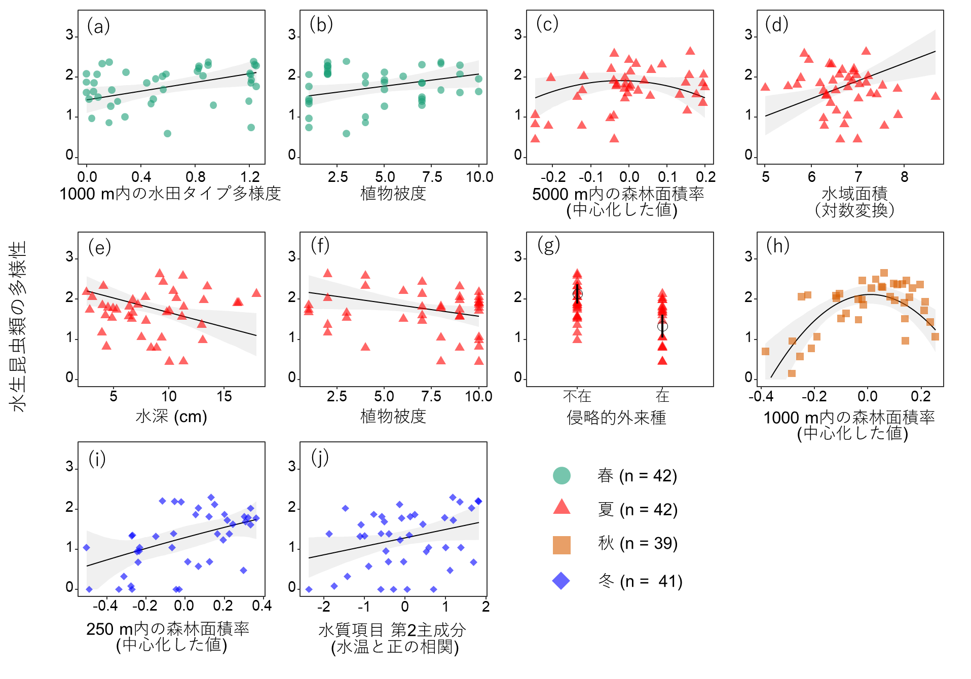 また夏には周囲5000 m以内、秋には周囲1000 m以内の森林が「中程度に」存在する場所で、多様性が高くなる傾向が見られました。これは、森林で採餌・越冬する種が集まりやすいことに加え、ユスリカ類などの餌生物が豊富になるためと考えられます。一方で、森林が多すぎると、飛翔中の水生昆虫類が上空から水域を見つけにくくなり、移入が制限される可能性があることから、森林は中程度に存在することが望ましいと考えられます。
