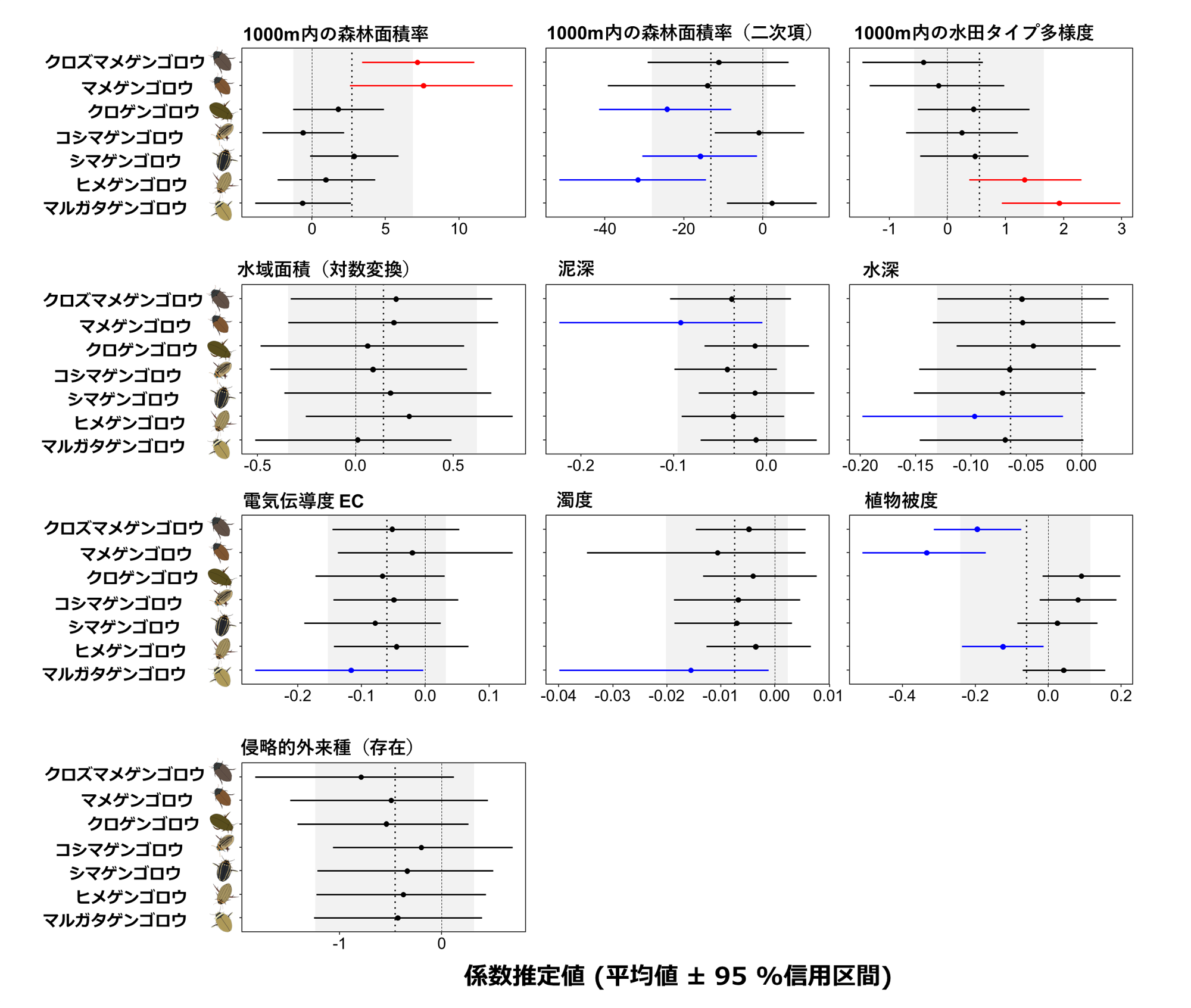 黒丸は各種に対する係数推定値の平均値を、エラーバーは95%信用区間を示す。有意に正の効果を示した場合は赤(95%信用区間が0を上回る)、有意に負の効果を示した場合は青(95%信用区間が0を下回る)で示した。点線および灰色網掛けはゲンゴロウ科全種に共通する係数推定値の平均値と95%信用区間を、実線はゼロを表す。