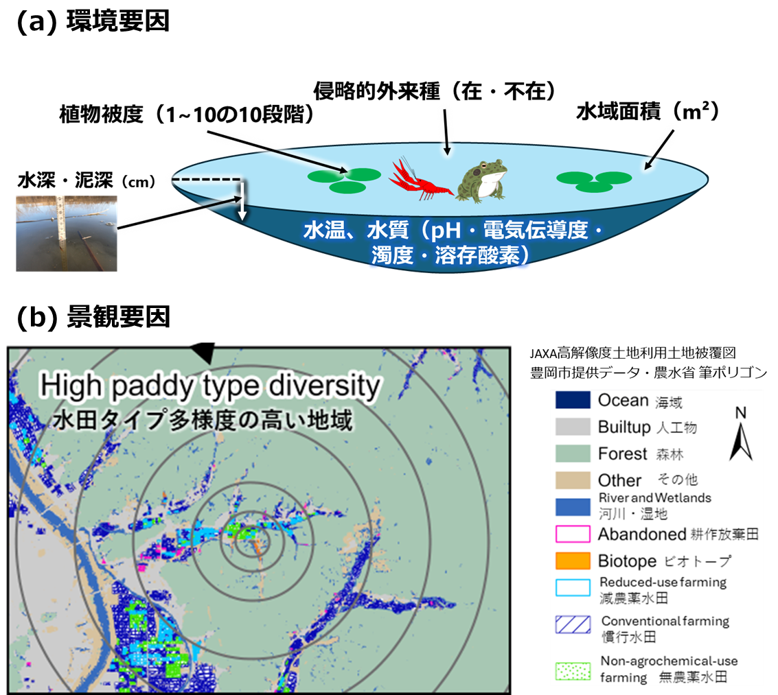 倉敷芸術科学大学生命科学部環境生命科学科の渡辺黎也助教、長崎大学の大庭伸也准教授、兵庫県立大学大学院の佐川志朗教授らの研究グループは、休耕田ビオトープに生息する水生昆虫類(トンボ類幼虫、カメムシ類、コウチュウ類)の多様性が、周囲1000 mの景観構造に強く影響されることを明らかにしました。特に、農法の異なる水田がバランスよく混在する「水田タイプ多様度」が高く、森林が中程度に存在する環境で、多様性が最も高くなることが分かりました(図1)。さらに、この影響の及ぶ空間スケールは季節によって変化することも示されました。