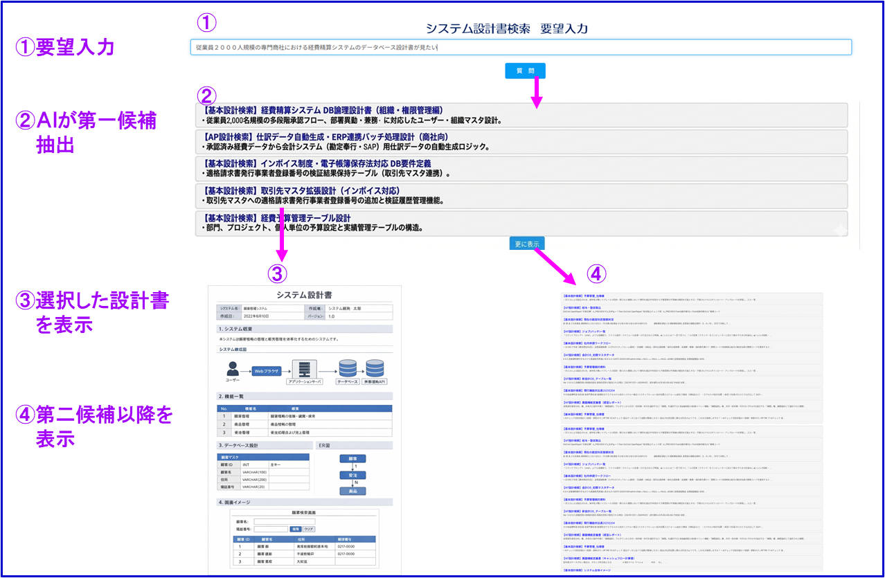こうした現状を踏まえ、過去に作成した設計書をAIに学習させ、自然文での要求だけで必要な設計書を瞬時に抽出、入手できる仕組みを開発しました。