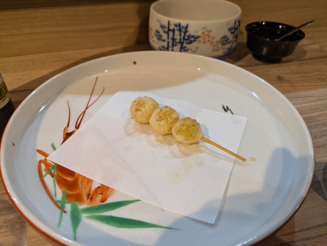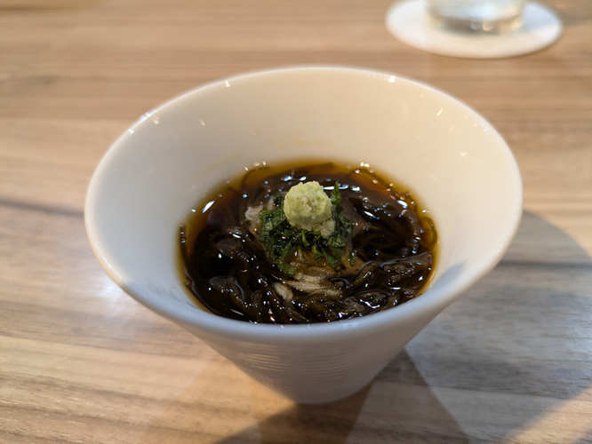 現在のコースでは、車海老や深海魚である「おおめはた」(あっさりながら旨味の濃い味わい)をはじめ旬の素材が登場。