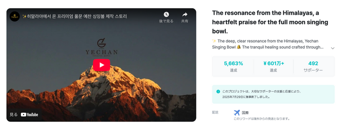 Makuakeで2月22日に公開された『YECHAN 音浴シンギングボウル』は、<strong>開始わずか1日で目標金額の43倍超となる435万円以上の応援購入を達成。</strong>