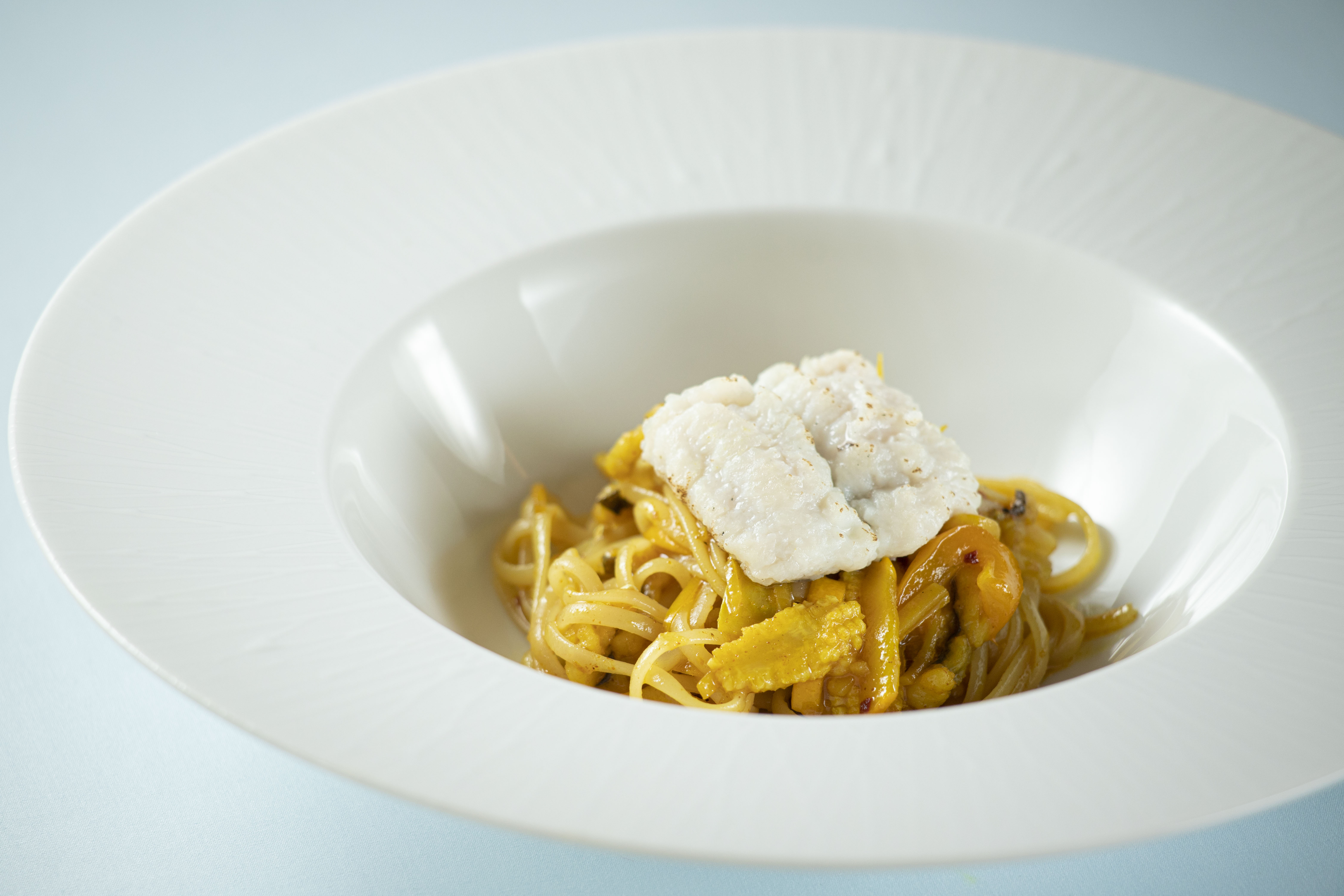 淡路鱧と黄野菜のアーリオオーリオ、 旬の魚の炭焼き サフランクリームソース、
