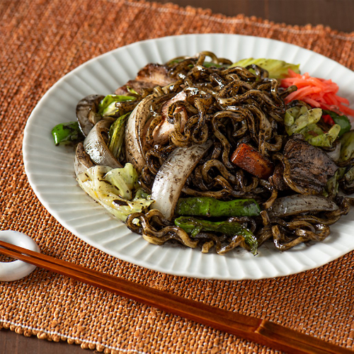 豚肉と野菜、焼きそば麺をフライパンで炒めるだけ!東村山市名物の「黒焼そば」の味わいをご家庭で手軽にお楽しみいただける調理だれです。