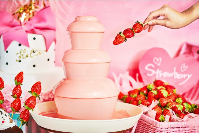 いちごティラミス、いちごロール、ベリーシフォンケーキ、大きいハートのショートケーキ、いちごのムース、ベイクドチーズケーキ、シャンパンゼリー、なめらかパンナコッタ、ベリークッキーシュー、ハートのマカロン、ポップコーン、ピンクのチョコレートファウンテン