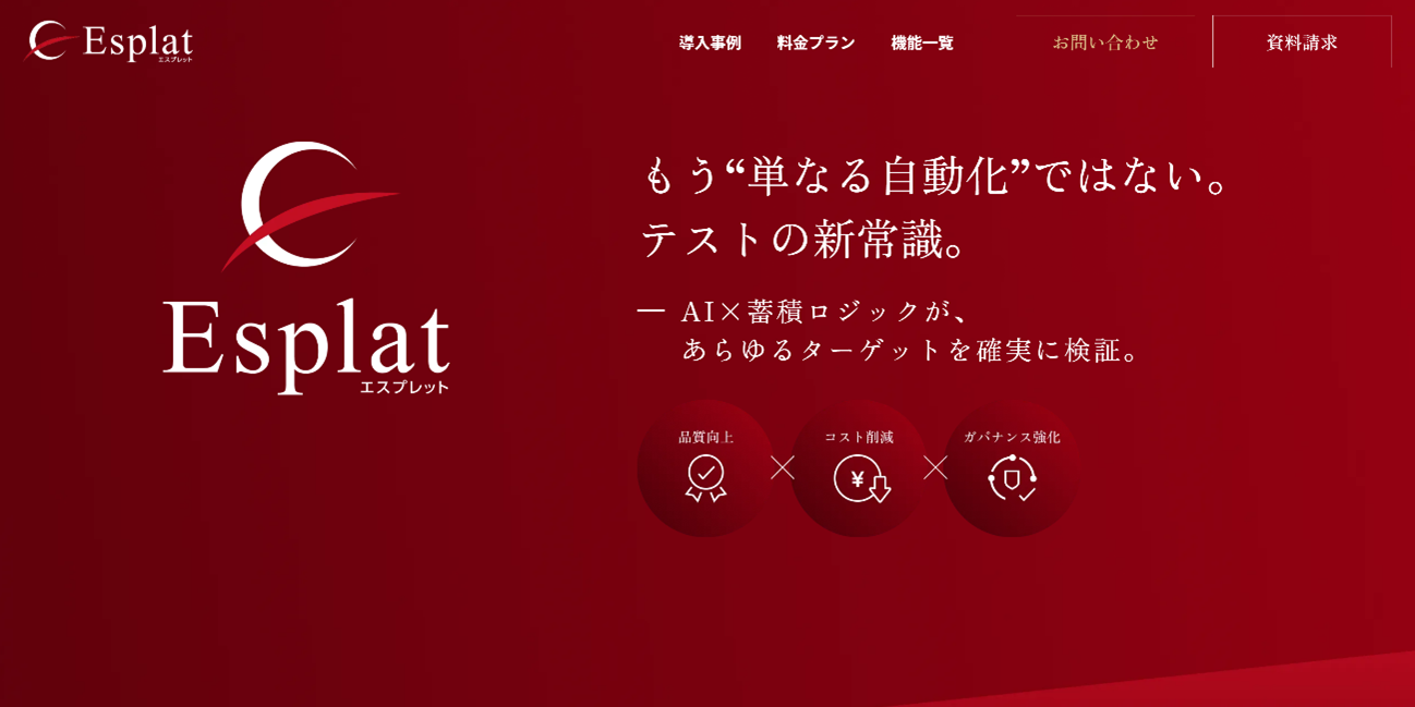 労働集約性の高いソフトウェア開発のテスト工程をAIテクノロジーで自動化し、2021年6月に特許を取得(特許第6902814号)した自社開発の「Esplat」を武器に、多くの企業でソフトウェア開発の効率化及び品質向上に寄与しています。