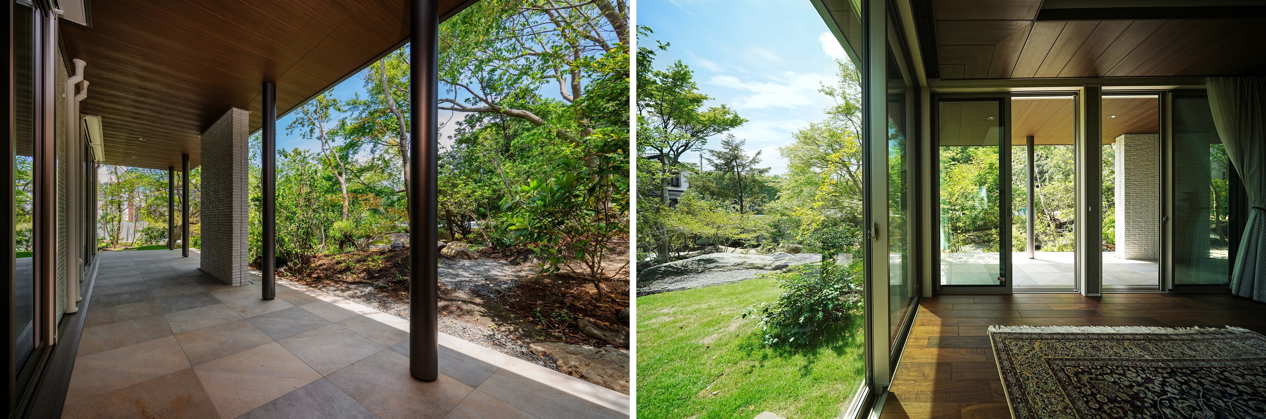 バルコニーから庭を臨む(左) 家の中から庭を臨む(右)