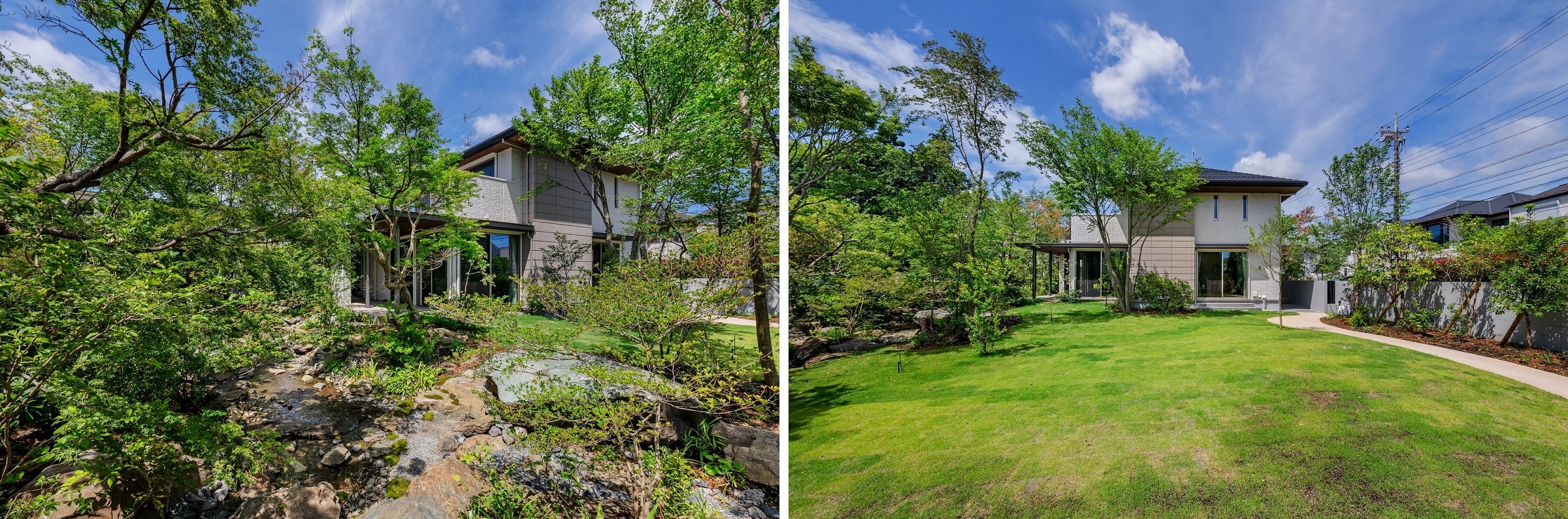 緑に囲まれたK様邸(左) 広がりのある芝生(右)