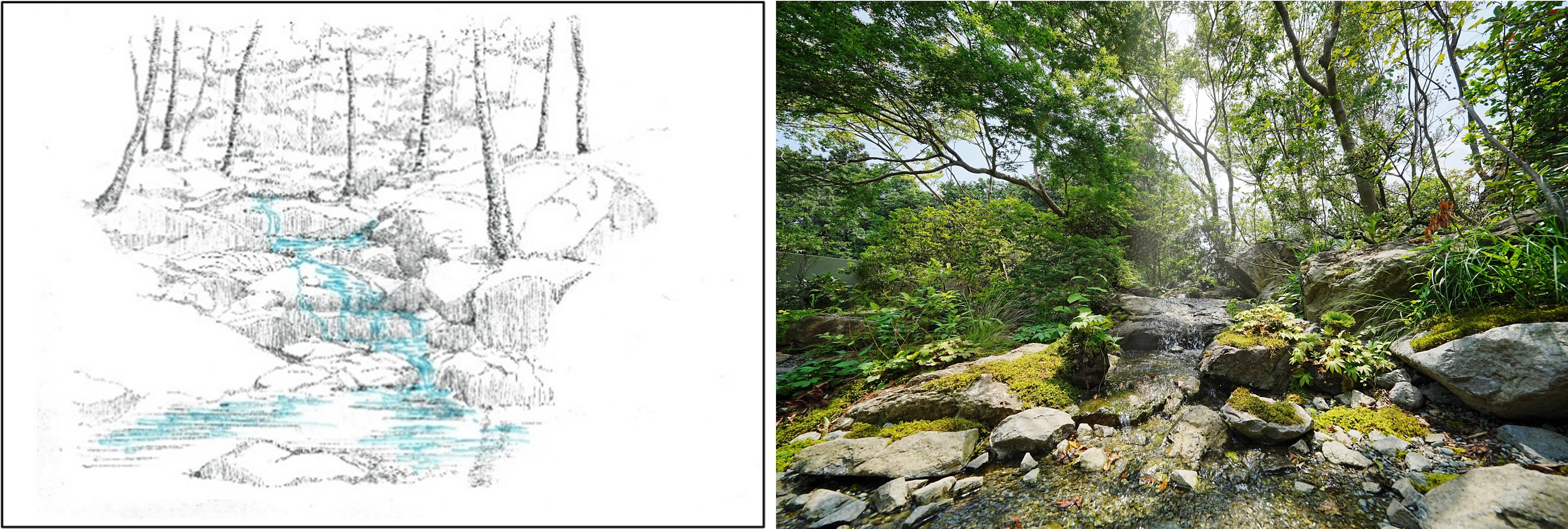 工事中は、完成イメージのスケッチを現場に貼り付け、職人さんと共に場所を確認しながら、ひとつひとつ丁寧に作業していきました。水の流れは専門部署の協力を得て、ポンプや水の補給について検討し循環させるようにしました。