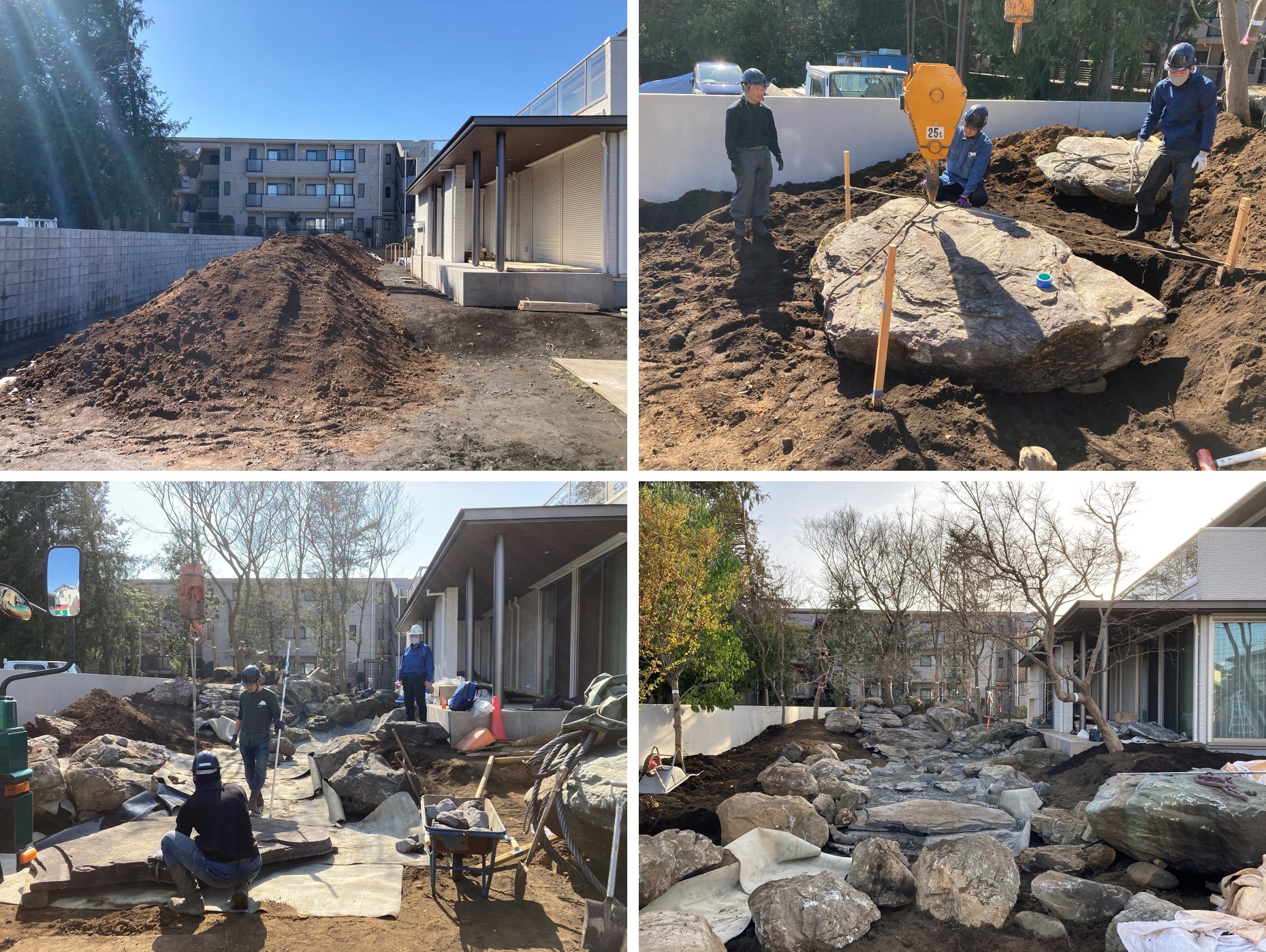 職人さんと共に作業する村上(左下)イメージに近くなった工事中の庭(右下)