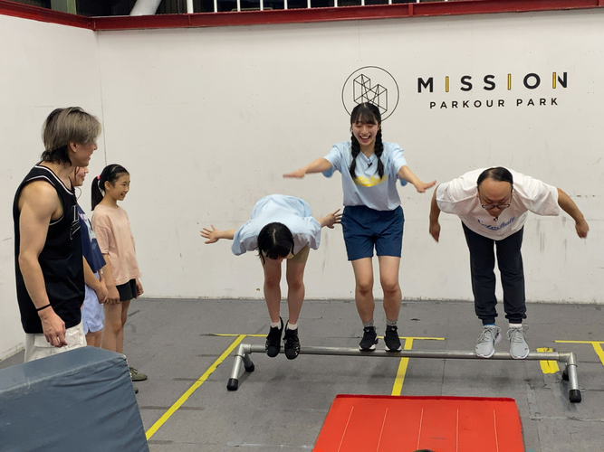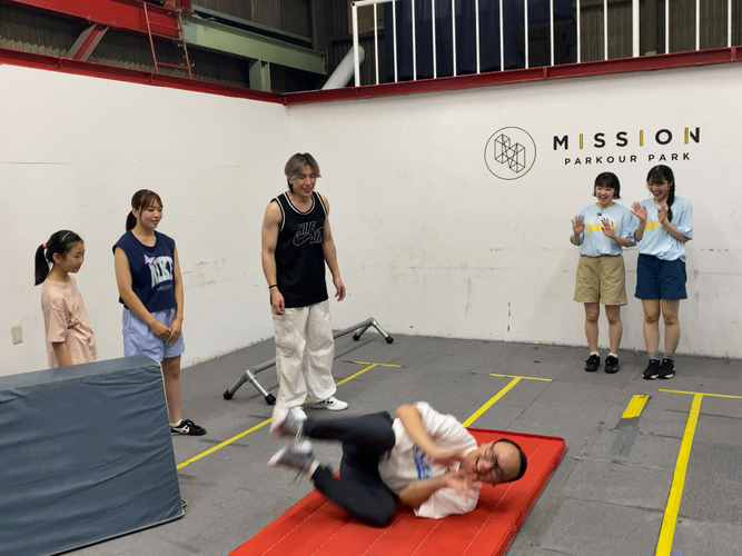 ここあ(甲斐心愛)&みちゅ(今村美月)、トレンディエンジェルたかしさんがパルクールの真髄を学びます。