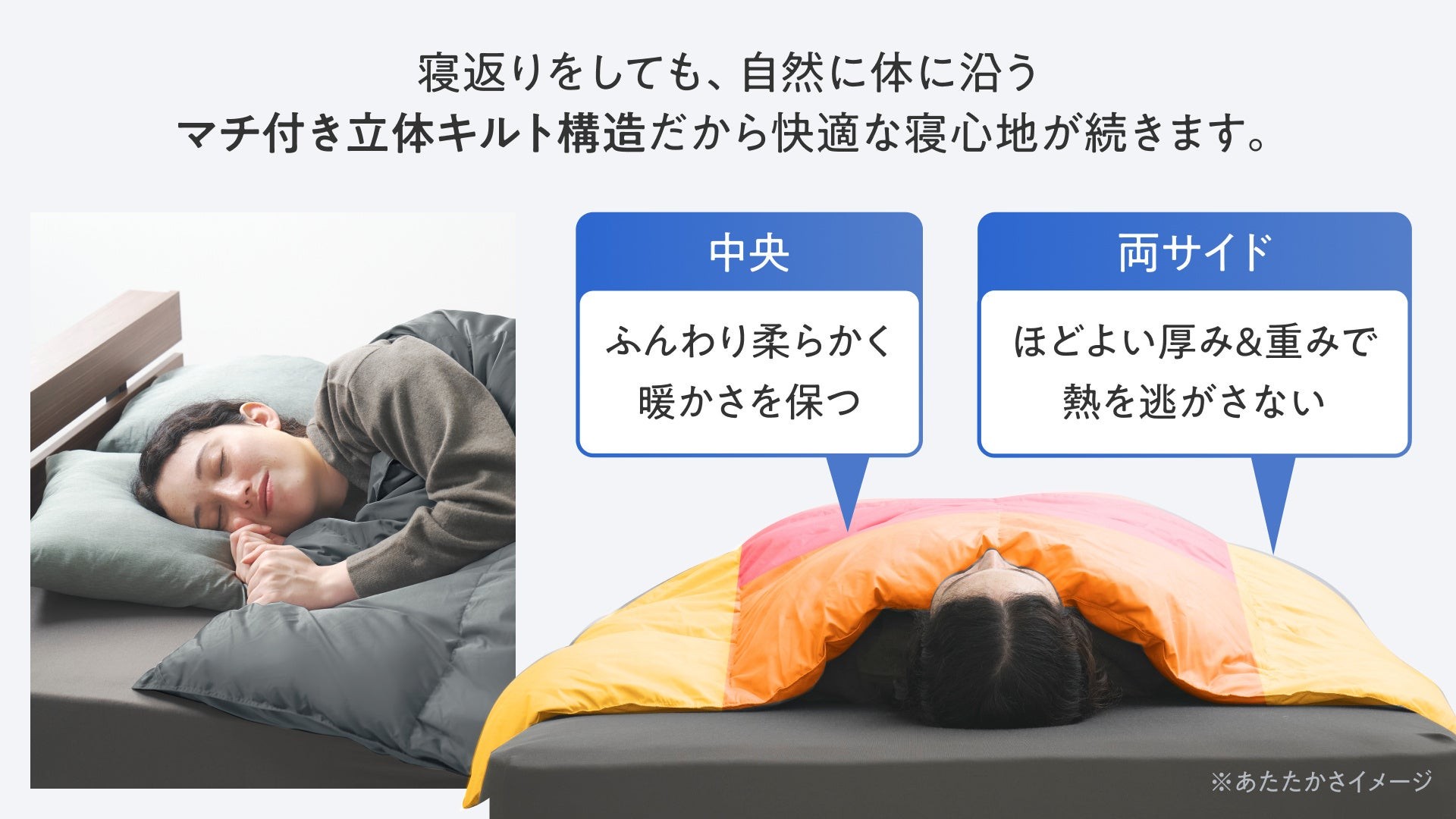 その想いから生まれた掛け布団です。冬の布団に入った瞬間のひんやり感や、夜中の冷えは、多くの人が抱える季節ならではの悩みです。そこで羽毛の速暖性と機能綿の保温力を最適に組み合わせたヒートゾーニング構造を採用し、中央はしっかり暖かく、両サイドは熱を逃しにくい点にこだわり、設計いたしました。