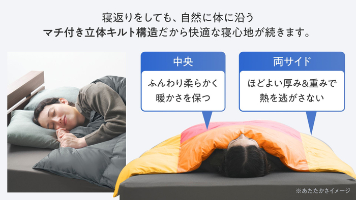 体に自然に沿う立体構造を採用しているため、寝返りを打っても隙間ができにくく、保温層がズレ