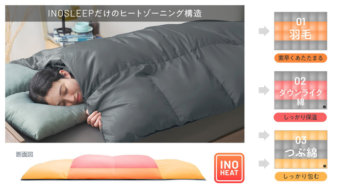 【INOSLEEP】暖房に頼りすぎない冬へ。3層構造により掛けるだけで温まる「羽毛ハイブリッド掛け布団」が登場